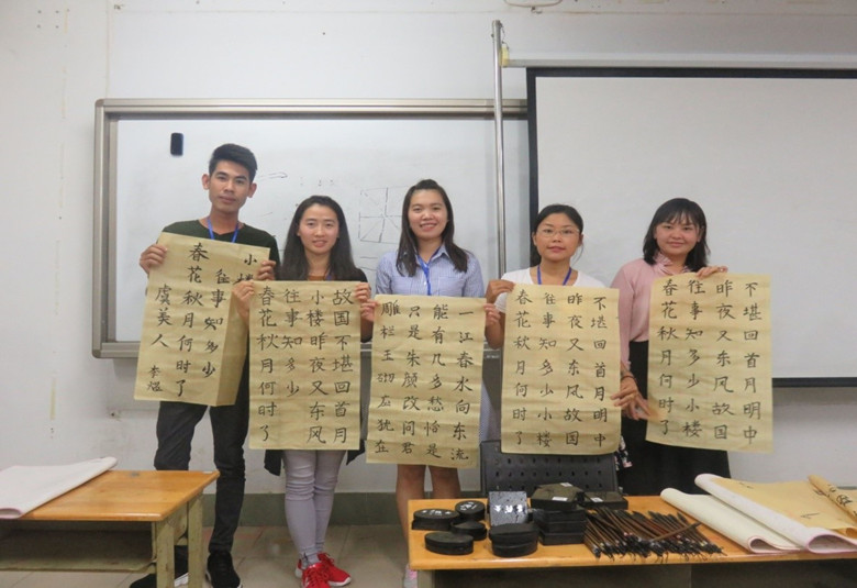 2018年8月13日, 缅甸华文教师证书培训班曲靖班学员在bat365在线平台官方网站古城校区209进行文化课程学习。早上,学员们在马丹丹老师的讲授下学习了汉字基础知识,让学员们对汉字有了进一步的了解。下午,由刘红娟老师进行现代汉语语音基础知识的讲授,让学员们加深了对汉语语音知识的认识。晚上,由张倩淑老师带领学员们学习中国书法,让学员们在充实的学习后能享受中华文化的独特魅力,劳逸结合。这些课程的设置不仅可以提升本次华文教师的知识储备,让学员们了解中华文化,也有利于提升自己华文教育的教学水平,让远在国外的华裔学子能更好的学习中国文化,增强对中华传统文化的认同感。